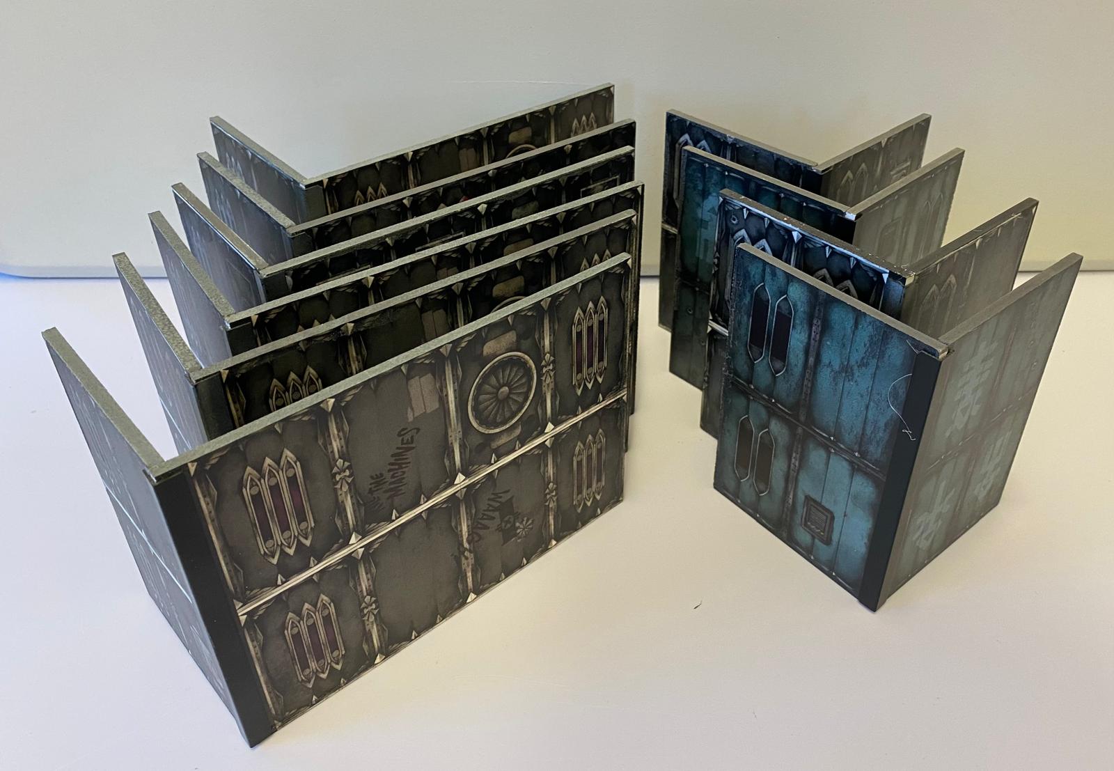 Each piece consists of sturdy printed wall panels that can be placed as straight walls corners or folded building structures. This allows for highly flexible table layouts while keeping setup fast and storage compact. The detailed textures create the look of heavy metal walls control panels vents and worn industrial surfaces while remaining fully playable and easy to read during games.